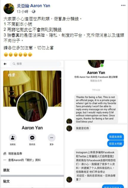 炎亞綸最近非常生氣的在臉書發文附上多張截圖並寫道,「大家要小心這個世界敗類,假冒身分騙錢!」還列點說出自己對於身分被盜這件事的心情,「不屑副本小號」、「再窮吃樹皮也不會無恥到騙錢!」、「臉書真的是個沒保障、隱私、制度的平台,充斥假消息以及這類不肖份子」。最後炎亞綸還不忘提醒各位粉絲多加注意,切勿上當!