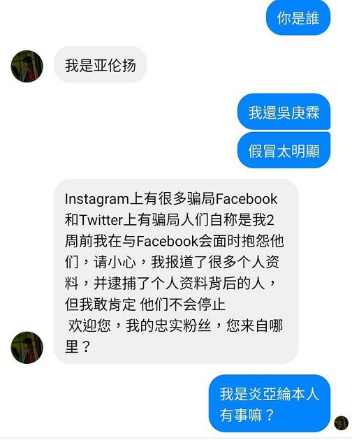 我們從其中一張截圖中可以看到,有一位陌生人在私訊中跟炎亞綸說,他是「亞倫揚」,讓炎亞綸傻眼的回,「我還吳庚霖,假冒太明顯!」沒想到對方竟回了一大串的簡體字,說在IG還有FB上面有很多騙局,「人們自稱是我,2周前我跟FB會面時抱怨他們,我報導了很多個人資料,並逮捕了個人資料背後的人!」最後還跟炎亞綸說,「我的忠實粉絲,你來自哪裡?」讓炎亞綸不耐煩的回說,「我是炎亞綸本人,有事嗎?」