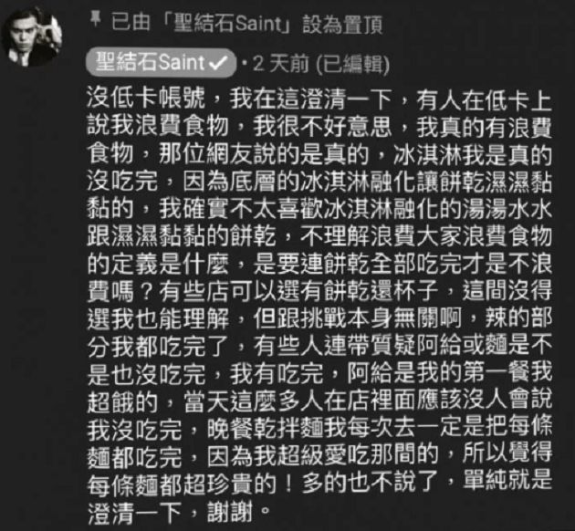 對於Dcard網友的質疑,聖結石也做出說明,自己確實有浪費食物的行為,沒有將冰淇淋吃完,因為不喜歡濕濕黏黏的餅乾,所以才將餅乾丟掉,但這部分和挑戰無關,因此他也重申,辣的部分都有吃完,午餐、晚餐也是一樣有食用完畢,盼大家不要誤會,特地對此澄清。