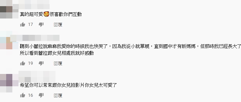 蕾菈的影片一出,有別以往的大尺度風格,改走溫馨親子路線,同樣受到網友好評,粉絲們也紛紛留言表示,「真的超可愛~很喜歡你們互動」、「美麗的蕾菈媽媽和女兒都好可愛!不錯!」、「馬馬我愛你 我都哭死了」、「母愛大噴發的一集」、「溫馨的親子頻道」、「女兒超可愛很溫馨~」、「女兒好可愛呀啊啊啊啊(萌心噴發」、「我看到哭是正常的嗎」、「女兒好貼心好可愛」。