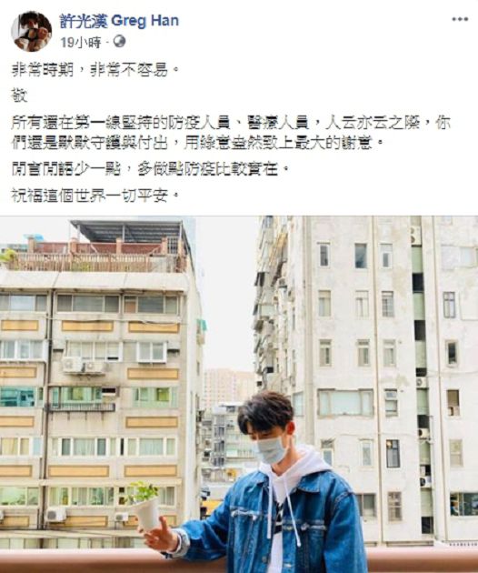不過,在這不安的時刻,許光漢也在社群平台上曬出自己戴口罩、手拿盆栽的照片,並寫在貼文內容中寫道,「非常時期,非常不容易!敬所有還在第一線堅持的防疫人員、醫療人員,人云亦云之際,你們還是默默守護與付出,用綠意盎然致上最大的謝意」。還不忘提醒大家,「閒言閒語少一點,多做點防疫比較實在」。