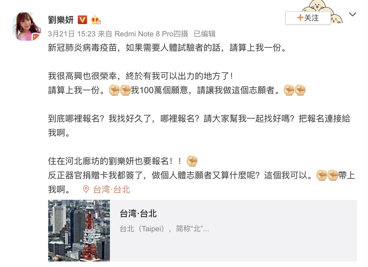 劉樂妍21日在微博發文寫道,「新冠肺炎病毒疫苗,如果需要人體試驗者的話,請算上我一份。我很高興也很榮幸,終於有我可以出力的地方了!請算上我一份。我100萬個願意,請讓我做這個自願者」。接著她也直接在貼文中詢問網友們,「到底哪裡報名?我找好久了,哪裡報名?請大家幫我一起找好嗎?把報名連接給我啊~住在河北廊坊的劉樂妍也要報名!」還非常豁達地說,「反正器官捐贈卡我都簽了,做個人體自願者又算什麼呢?這個我可以,帶上我啊!」