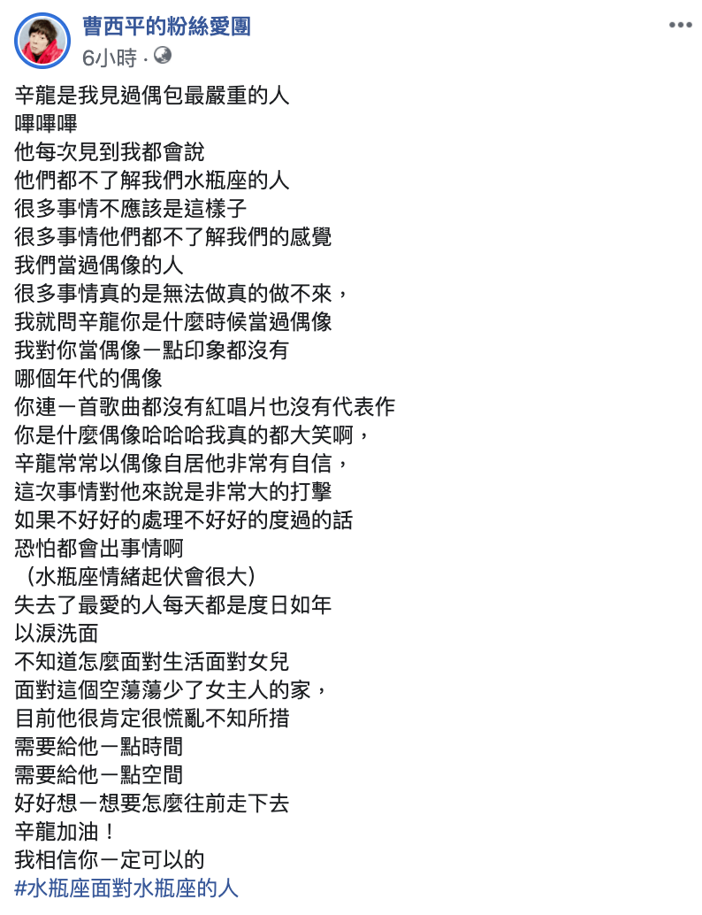 此外,曹西平還提到,「失去了最愛的人,每天都是度日如年、以淚洗面,不知道怎麼面對生活面對女兒,面對這個空蕩蕩少了女主人的家!目前他很肯定很慌亂不知所措,需要給他ㄧ點時間、空間,好好想ㄧ想要怎麼往前走下去」。還不忘加上Hashtag「#水瓶座面對水瓶座的人」,讓大家知道同樣身為水瓶座,曹西平真的懂辛龍的心情。