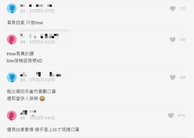 貼文一出引起不少網友討論,更成為論壇的熱門文章,網友們大讚HowHow「認真防疫的金城」、「How哥清流」、「我們How哥就是帥」、「潔身自How」、「我大how哥永遠不壞讓我失望」、「How哥必須推!」、「我愛他」、「How哥真的讚btw接機超有梗XD」,同時也有網友指出Youtuber「台客劇場」幾乎是全程戴著口罩上台才現摘,落實防疫措施的舉動讓網友好評不斷。