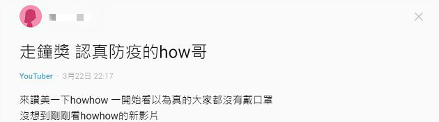 日前,HowHow在頻道上釋出全新影片「被接機囉」,紀錄參與走鐘獎的過程與心得,當一行人走過紅毯進到會場時,HowHow戴著口罩笑稱自己終於圓滿「上次從國外回來沒被接機」的遺憾,同時表示「進到會場後就是防疫version」,這樣的舉動引來不少網友稱讚,紛紛在影片底下留言表示「有防疫version我就給respect」、「How ger有戴口罩好棒喔」。