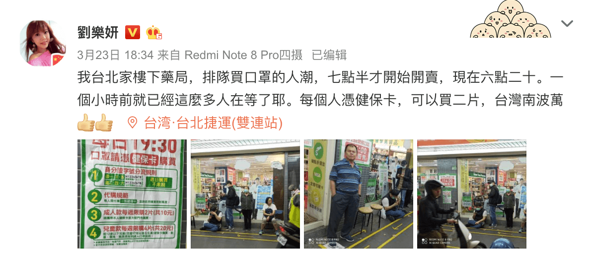 後來,劉樂妍也在微博上PO出自己上街拍下的台灣日常,讓中國網友看看台灣路上到底有多少人戴著口罩出門,並且還走到藥局去拍那些排隊買口罩的人們,並笑說,「每個人憑健保卡,可以買二片,台灣南波萬!」還貼出手比讚的圖案,但其實台灣目前成人可以購買口罩的數量早已調整過,可能她還沒有實際排隊買過,所以資訊不太正確。