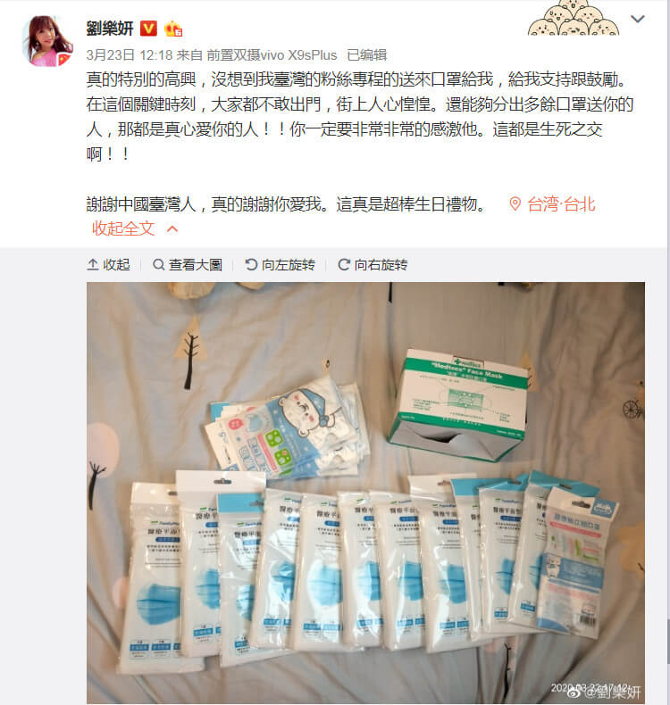 劉樂妍23日生日,她先是在微博發文附上一張床上放了滿滿口罩的照片並寫道,「真的特別的高興,沒想到我台灣的粉絲專程送口罩來給我,給我支持跟鼓勵!在這個關鍵時刻,大家都不敢出門,街上人心惶惶,還能夠分出多餘口罩送你的人,那都是真心愛你的人!你一定要非常非常的感激他!」並且認為對方這樣的溫暖舉動,「都是生死之交啊!」