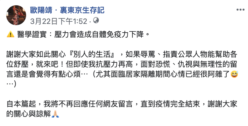 最後,歐陽靖也特別提到,「我將不再回應任何網友留言,直到疫情完全結束,謝謝大家的關心與諒解!」不希望再受到任何網友的負面留言來影響到自己的情緒。而其他網友看完也都紛紛留言表示,「的確不需要和不了解自己的人多交集,好好保重自己、關心愛自己的人」、「保持好心情、好好照顧自己、安心待產」、「照顧好自己和寶寶,默默的回台灣就好,祝妳一切平安」、「疫情的來臨,我們更該是一條心,然後共同渡過才是」、「那些酸民都病了...是可憐的人」、「其實真的很煩的話,先關一陣子臉書也可以喔!」。