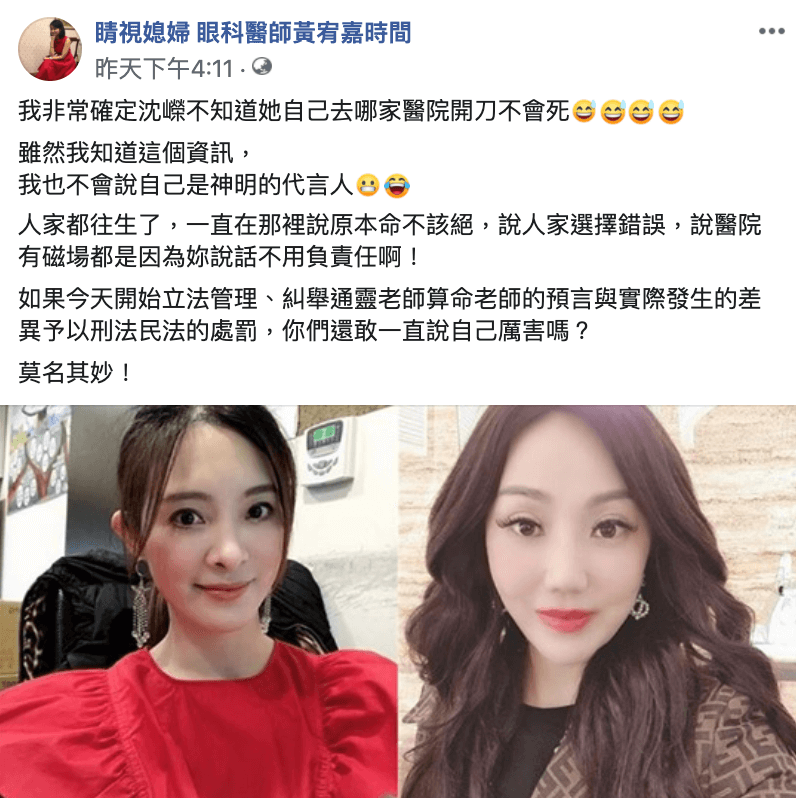 此話一出,馬上引起許多反彈,而眼科醫生黃宥嘉也發文痛批,「我非常確定沈嶸不知道他自己去哪家醫院開刀不會死!劉真都已經往生了,還說她選擇錯誤、醫院有磁場...等不負責任的話!」並且強調,「若今天開始立法管理、糾舉命理師的預言跟實際發生的差異,並予以刑法民法處罰,你還敢說自己厲害?莫名其妙!」
