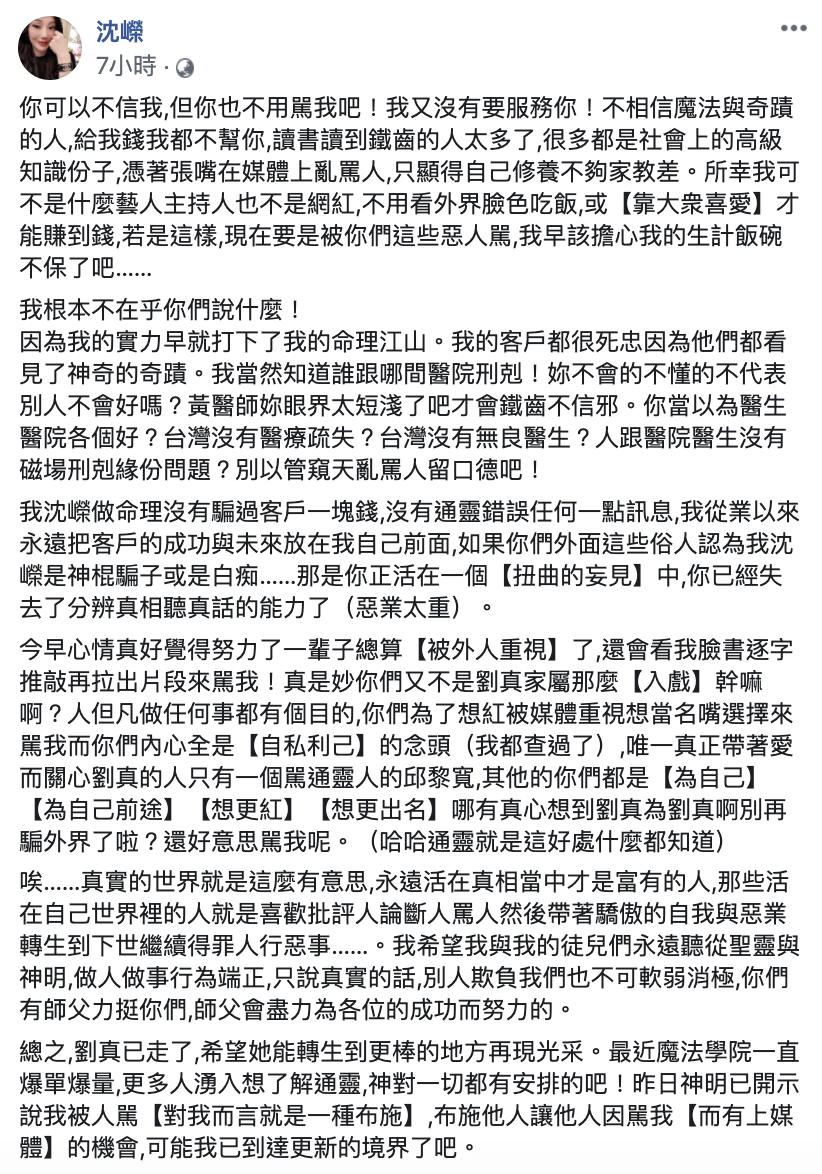 此外,沈嶸還提到,劉真本來命不該絕,「選擇錯誤付出很大的代價!」被網友們瘋狂砲轟說她「馬後砲」、「根本在消費死者」,而她也不滿的說,「我當然得馬後砲啊!劉真去開刀又不會事先跟我說,我也只能事後通靈,不過我救不了劉真,但我可以救很多相信自己跟醫院緣分的人!」