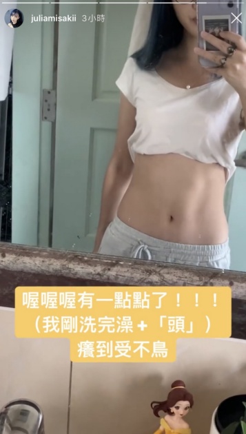 咪妃經常在社群平台上分享日常生活,近期咪妃經常練舞,勤奮運動的成果,讓她身材越來越好,線條更加明顯!近日咪妃在限時動態上,曬出一張對鏡子自拍的美照,從中可以看到,她衣服只穿了一半,秀出大片肌膚,令人驚豔的是,咪妃不但腰身整個凹下去一點贅肉都沒有,肚子上更出現腹肌線條,身材再進化,讓人不得不佩服!