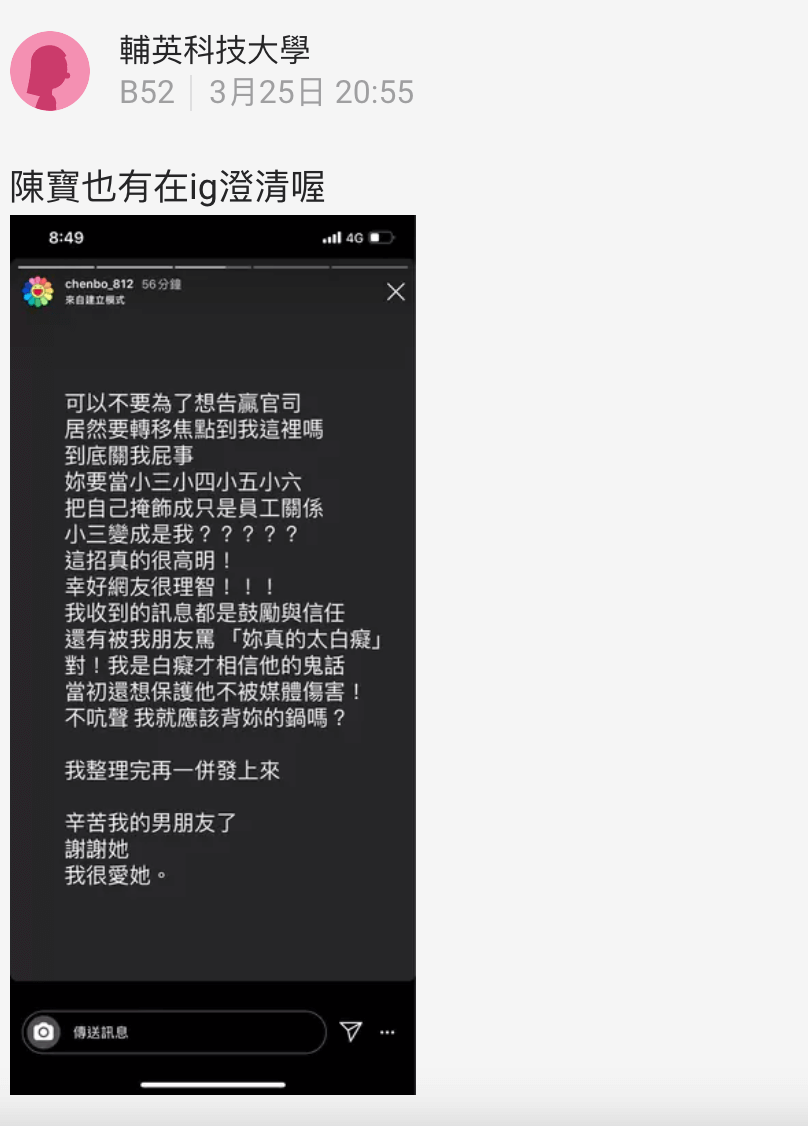 而謝和弦也在「跟粉絲上床」的事件爆發之後,在IG上發文貼出了一則截圖,寫著「關於謝的事情,來龍去脈我該發文嗎?不要再傳新聞來,之前報過了,我跟他沒有在一起、沒有打砲!」讓大家看到那位女粉絲的回應,以及澄清自己並沒有跟女粉絲打砲,而女粉絲後來也有在自己的IG限時動態中發文澄清,被網友截圖PO到Dcard上,讓大家看看當事人的說法。