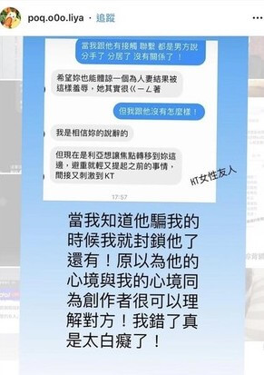 陳寶罵完莉婭之後,也不忘罵一下謝和弦,並貼出自己跟KT友人的對話,說自己會跟謝和弦接觸,都是男方說他跟KT已經「分手了、分居了、沒有關係了」!還強調「我跟他沒有怎樣!」希望大家不要再誤會她,還說「當我知道他騙我,我就封鎖他了,我錯了,真是太白癡了!」