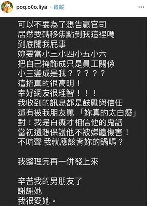 而莉婭最近則是因為Keanna公開的「毀滅性證據」跟謝和弦女粉絲陳寶槓上,讓陳寶氣得在社群平台上發文怒嗆,「到底關我屁事?可以不要為了想告贏官司,居然要轉移焦點到我這裡嗎?妳要當小三小四小五小六,把自己掩飾成只是員工關係,小三變成是我?這招真的高明!」認為莉婭是為了大贏官司,才把小三這個罪名掛到她身上。