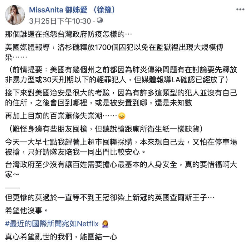 御姊愛最近在臉書上發文無奈寫道,「那個誰還在抱怨台灣政府防疫怎樣的...美國媒體報導,洛杉磯釋放1700個囚犯以免在監獄裡出現大規模傳染......接下來對美國治安是很大的考驗,因為有許多這類型的犯人並沒有自己的住所,之後會回到哪裡,或是被安置到哪,還是未知數!再加上目前的百業蕭條失業潮...」,不過最讓人驚訝的是,御姊愛還提到,「難怪身邊有些朋友『囤槍』,但聽說槍跟廁所衛生紙一樣缺貨!」
