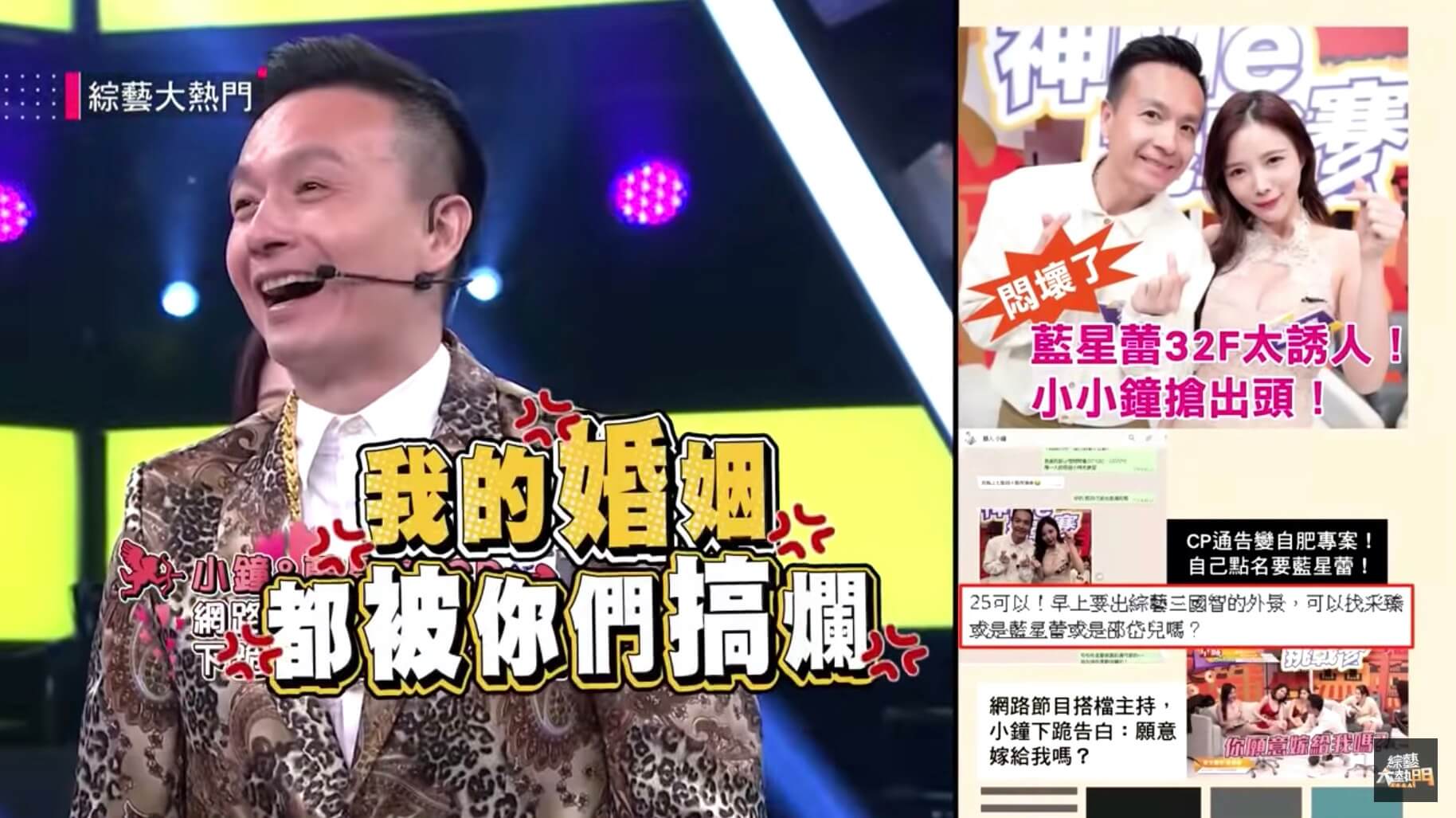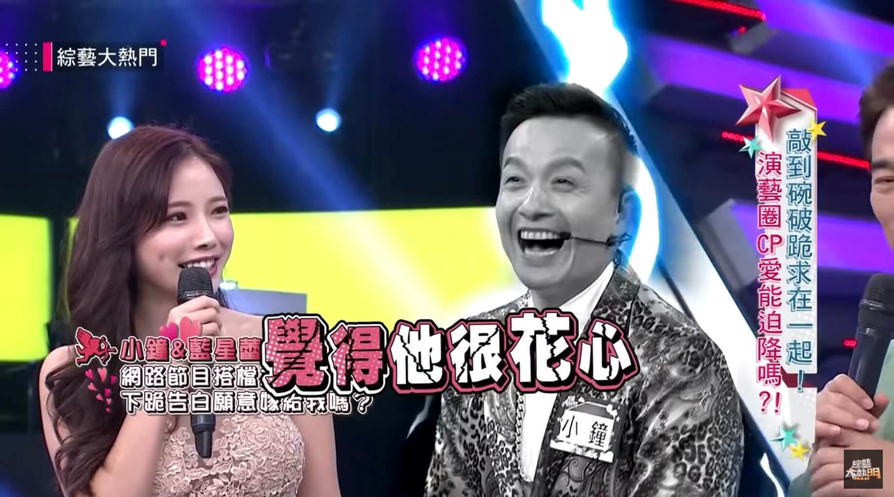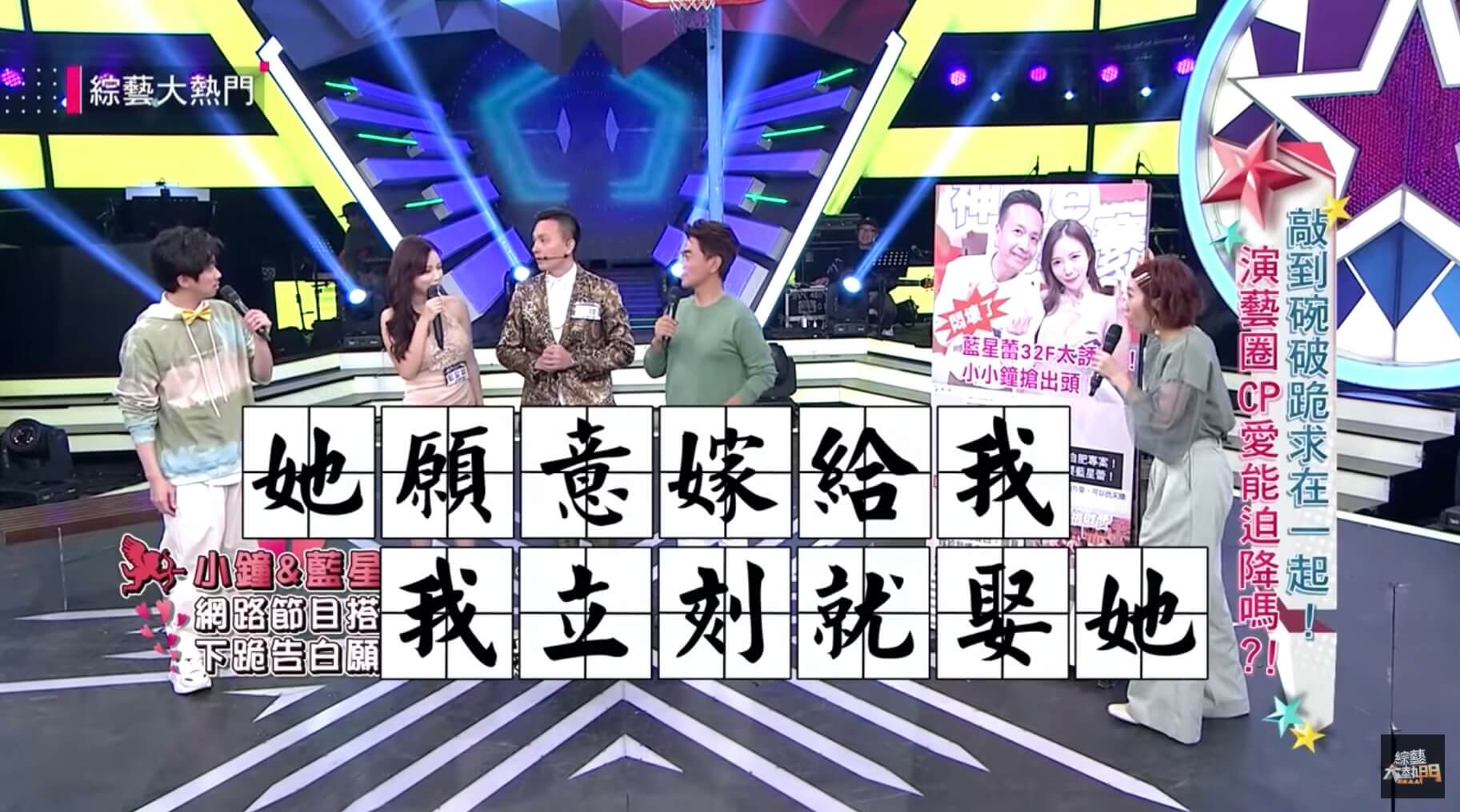 小鐘最近在《綜藝大熱門》節目中參加了CP組合的表演單元,他跟新加坡DJ藍星蕾湊成一對,過去他曾經在錄影棚內跟女方下跪「求婚」,還曾經放話說,「你如果願意嫁給我,我立刻就娶!」雖然當時求婚只是開玩笑,但他們現在互動依然散發出粉紅色泡泡,讓大家都把他們湊成CP,讓他們一起籌備精彩的表演!