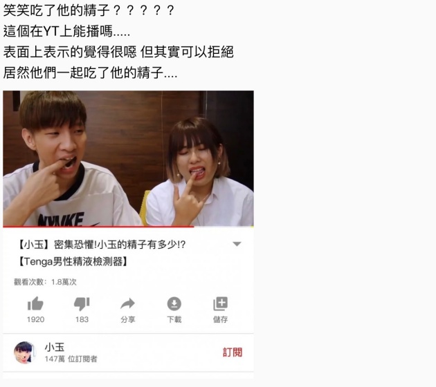 日前小玉上傳新片,影片中開箱男性精液檢測器,實測自己的精子數有多少。當小玉將所有需要的「道具」準備好後,兩人開始使用檢測器,觀察精子的活力等,兩人在觀察過後,笑笑提出建議讓小玉嚐嚐看味道,最後小玉也反過來要求一起,於是兩人手沾上後一同吃下去,笑笑隨即不斷乾嘔,狂飆髒話直呼噁心!