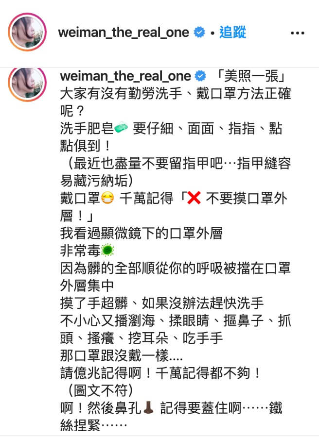 此外,魏蔓還跟大家分享自己的親身經歷,「我看過顯微鏡下的口罩外層,非常毒!因為髒的全部順從你的呼吸被擋在口罩外層集中,摸了手超髒!如果沒辦法趕快洗手,不小心又撥瀏海、揉眼睛、摳鼻子、抓頭、搔癢、挖耳朵、吃手手,那口罩跟沒戴一樣!」並且希望大家「億兆記得!千萬記得都不夠!鼻孔記得要蓋著,鐵絲捏緊!」非常誠懇的請大家要做好防疫。
