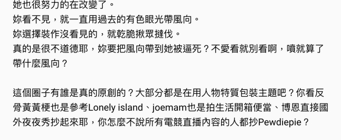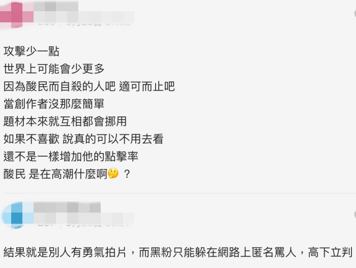 Dcard文章一出,引來不少其他網友紛紛贊同原PO觀點表示,「看完這篇覺得分析的很公正」、「本來就很常看到youtuber抄來抄去的啊!雖然主題一樣,但內容都會有不一樣的地方啊」、「我覺得噴她拍片問題是OK,別涉及到人身攻擊就好」、「攻擊少一點,世界上可能會少更多,因為酸民而自殺的人吧 適可而止吧」、「結果就是別人有勇氣拍片,而黑粉只能躲在網路上匿名罵人,高下立判」。