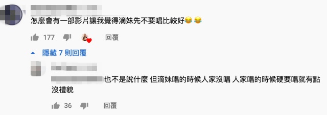 有網友在留言區表示,「怎麼會有一部影片讓我覺得滴妹先不要唱比較好」、「滴妹唱的時候人家沒唱,人家唱的時候硬要唱就有點沒禮貌」、「感謝滴妹讓我了解會不會合音還是有差,但是氣氛很好」、「滴妹唱法是比較用力,高的聲音一直吃掉小Ju QQ很會帶氣氛ok拉但是下次...QQ」。