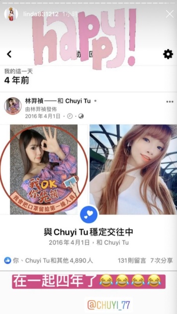 琳妲經常在IG分享日常生活,和粉絲們互動,今日更新限時動態時,驚喜曬出私人臉書的畫面,只見照片中,琳妲和同是啦啦隊隊員的「曲羿」掛上穩定交往中,時間從2016年開始,讓琳妲不禁笑噴「在一起四年了」!不過仔細一看,兩人交往的日期是在愚人節當天,也因此這場小惡作劇不攻自破,但仍引起許多粉絲關注!