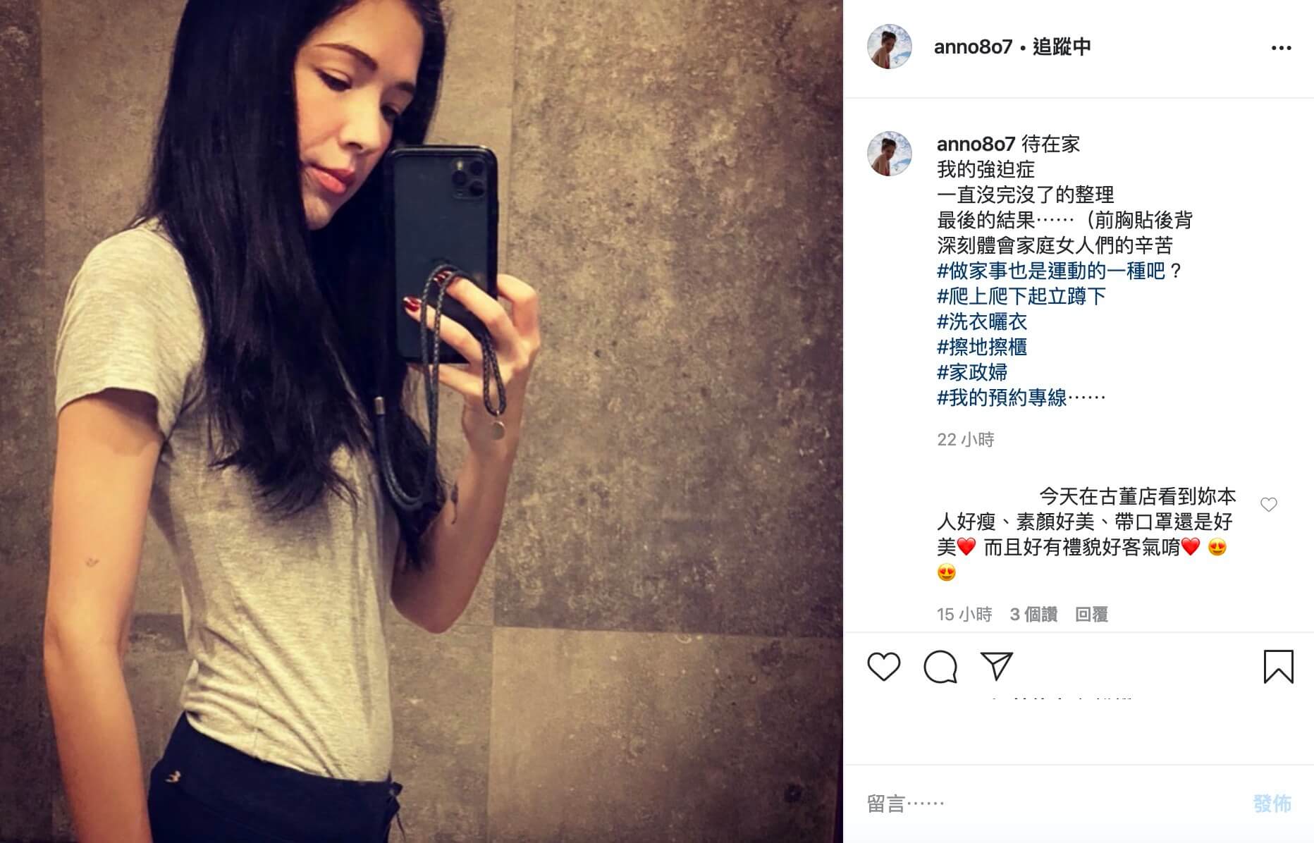 許瑋甯最近在IG上發文貼出了自己在家防疫的生活日常,並且在貼文中寫道,「待在家...我的強迫症讓我一直沒完沒了的整理,最後的結果...前胸貼後背!深刻體會家庭女人們的辛苦」,並在Hashtag寫下,「#做家事也是運動的一種吧? #爬上爬下起立蹲下 #洗衣曬衣 #擦地擦櫃 #家政婦 #我的預約專線」。