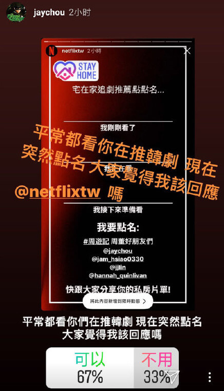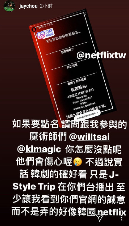 沒想到,Netflix似乎是察覺到周董的不開心,馬上在IG限時動態宣傳《周遊記》,並以互動的方式來詢問粉絲們最近都在追什麼劇,在貼文最下方還點名了周杰倫、昆凌、林俊傑、蕭敬騰的帳號,希望藝人們也可以分享出自己最近的「私房片單」!