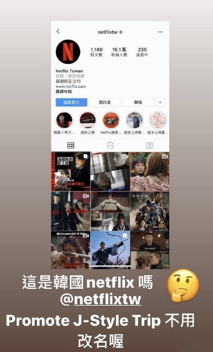 周杰倫在IG的限時動態發文,並且貼出「台灣Netflix」的IG官方帳號版面,讓大家看見帳號裡面全都是跟韓劇有關的宣傳影片,而他所主持的《周遊記》卻只有在3月10日出現過一次,讓他忍不住發聲質疑,「這是韓國Netflix嗎?Promote J-Style Trip不用改名喔」,可以看得出周董似乎是對串流平台宣傳《周遊記》頻率極低感到不滿。