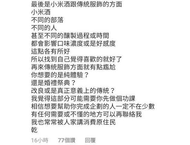 最後愛莉莎莎在跟許多原住民溝通後,修改文案中外界認為不適當的字眼,對此她也表示歉意,直呼自己是真心喜歡並且想深入了解原住民文化,大學時也參加原住民社團,在山上喝小米酒對她來說是一段最美好的回憶,最後她強調「別在說我歧視了好嗎,真的希望能讓大家好好了解原住民文化,停戰!」。