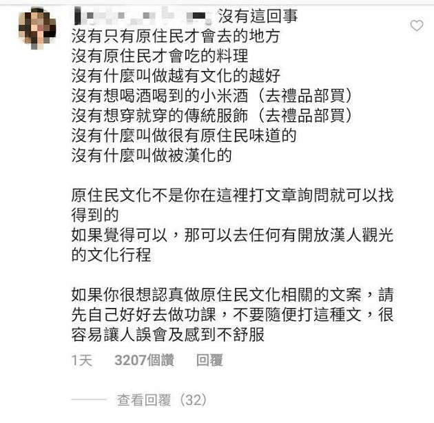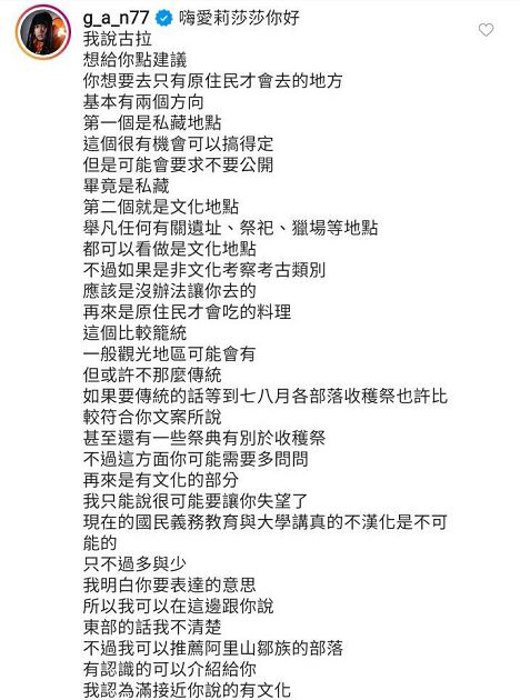 愛莉莎莎的文案讓不少網友反感,直呼「只有我覺得這段話很歧視原住民嗎?」、「與其說歧視,消費原住民可能更貼近妳的行為」、「原住民文化不是你在這裡打文章就可以找到的,請先做好功課不要隨便打這種文,很容易讓人誤會及感到不舒服」、「不要漢化是什麼意思?很有文化是什麼意思?」、「沒文化真可怕」。除此之外,同樣是原住民的網紅「古拉」也提醒她,某些原住民才會去的地方可能觸及部落文化,是不能隨意開放的,強烈建議她的企劃細節都可以事先做過功課,一定會有許多人願意幫助她。