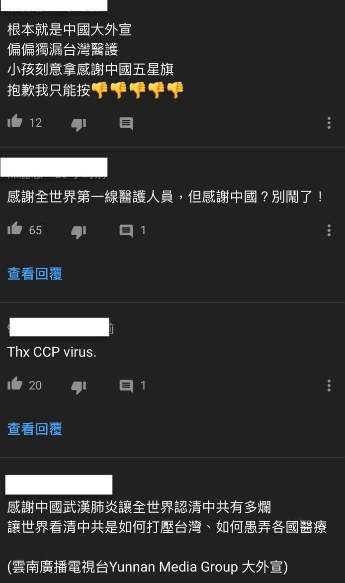 其他網友看完這首歌之後也都紛紛留言表示,「MV的內容竟然是中國的置入行銷!看了令人非常憤怒和遺憾」、「武漢肺炎的根本原因就是中共掩蓋疫情,沒有控制下來!現在憑什麼叫大家感謝中國?」、「搞的好像中國政府是全世界的救星似的,明明就是全世界的毒瘤」、「沒有武漢病毒就沒這首歌」、「明明該感謝的是全世界第一線的防疫人員」、「應該要謝謝全世界的醫護人員,包含中國醫護在內!而不是中國!」。