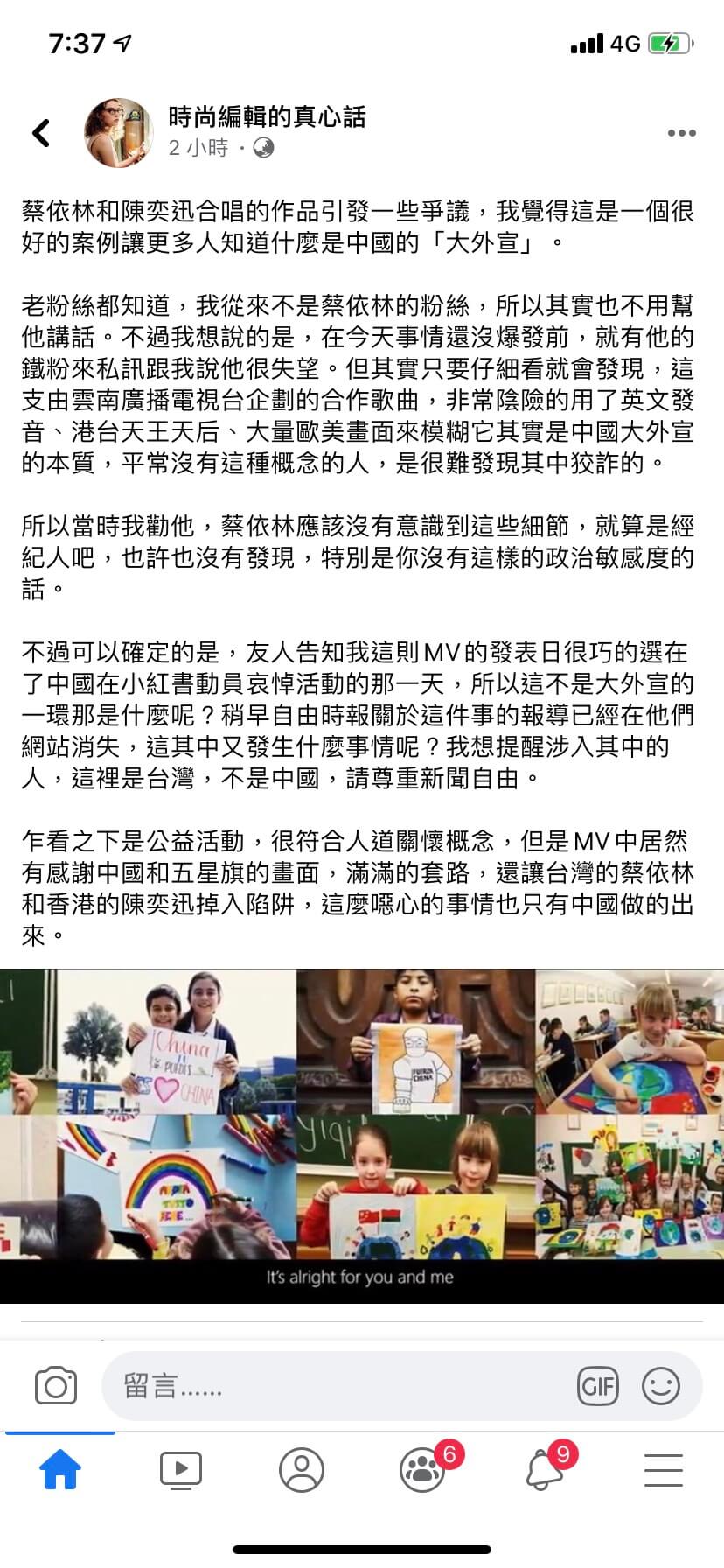 此外,粉專內文中也提到,「這則MV發表日很巧的選在中國在小紅書動員哀悼活動的那天,這不是中國大外宣的一環,那是什麼?而稍早自由時報有關於這件事的報導也在網站消失了,我想提醒涉入其中的人,這裡是台灣,不是中國,請尊重新聞自由!」並痛批,「公益活動很符合人道關懷,但MV居然出現感謝中國跟五星旗,滿滿的套路,讓台灣的蔡依林跟香港的陳奕迅掉入陷阱,只有中國做得出來」。