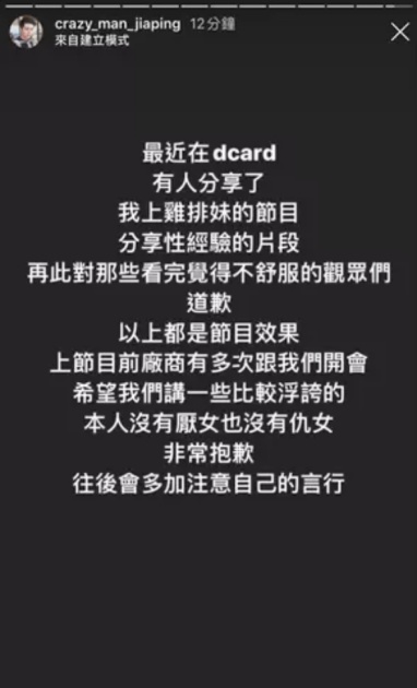 Dcard持續熱議一陣子後,晨灰也於限時動態道歉表示,影片皆是節目效果,拍攝前與廠商開會討論時,對方希望瘋男可以講一些浮誇的東西,最後晨灰鄭重聲明,「本人沒有厭女也沒有仇女,非常抱歉,往後會多加注意自己的言行」。