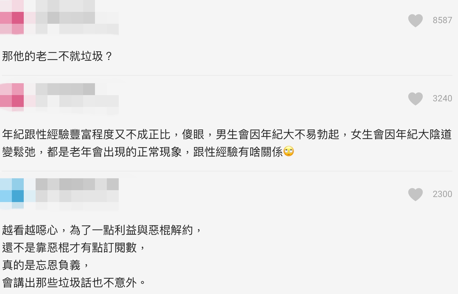 晨灰一番言論瞬間在Dcard掀起熱議,網友們紛紛留言表示,「那他的老二不就垃圾?」、「年紀跟性經驗豐富程度又不成正比,傻眼,男生會因年紀大不易勃起,女生會因年紀大陰道變鬆弛,都是老年會出現的正常現象」、「看完直接厭惡」、「頻道要改名叫噁男嗎」、「在節目上講話還不修飾用詞,非常不妥」、「腦袋是不是裝水才會有這個言論」、「上次滑到這影片很無言,根本看不下去噁心死⋯」、「沒知識也該管好自己的嘴巴」。