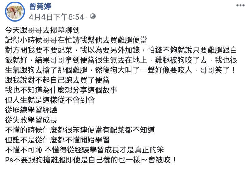 曾莞婷笑說,「我也不知道為何想分享這個故事,但人生就是從不會到會,從歷練學習經驗,從失敗學習成長!不懂的時候,什麼都很笨,連便當有配菜都不知道,但誰不是從什麼都不懂開始學習呢~不懂不可恥,不懂得從經驗學習成長,才是真正的笨!」最後她也不忘提醒網友們,「不要跟狗搶雞腿,即使是自己養的也一樣~會被咬!」