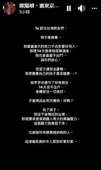 歐陽靖從日本返台後,正在執行居家檢疫,而她5日也在臉書上透露自己即將結束14天的居家檢疫期,並透露說「結束之後最想做的事,就是產檢!」可是其他網友看了都覺得這樣不太妥當,「就算14天的檢疫結束,還是應該乖乖待在家,不要把病毒傳給別人!」