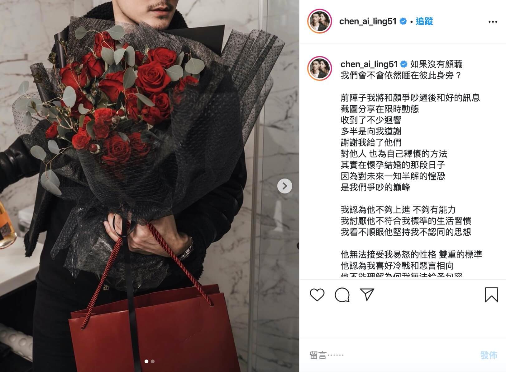 陳艾琳最近在IG上發了一篇長文並寫道,「如果沒有顏蘵,我們會不會依然睡在彼此身旁?」第一句話,就讓許多網友都緊張了起來,接著她又提到,「其實在懷孕結婚的那段日子,因為對未來一知半解的惶恐,是我們爭吵的巔峰!我認為他不夠上進、不夠有能力,我討厭他不符合我標準的生活習慣,我看不順眼他堅持我不認同的思想!」