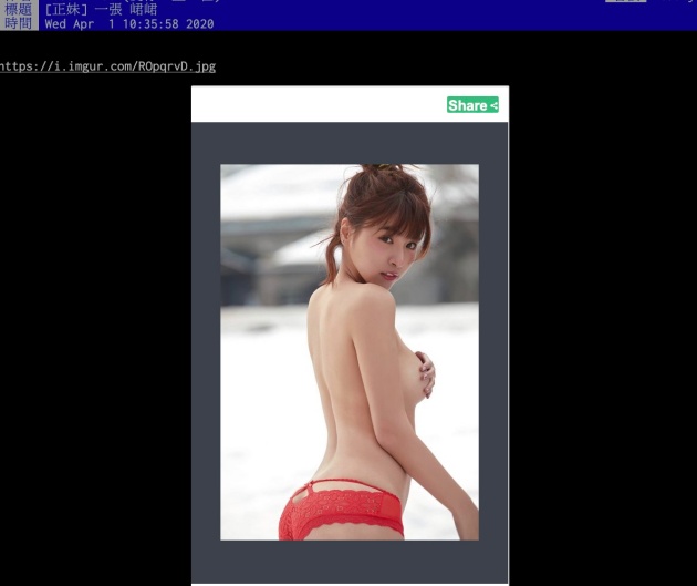 PTT是台灣網友最愛使用的網路論壇之一,其中表特版更是深受男網友喜愛,許多人會在此分享心目中正妹的照片,日前有位鄉民貼出心目中啦啦隊女神「峮峮」的照片,超兇模樣瞬間引起爆卦!從照片中可以看到,峮峮上半身完全解放,只用手遮住粉紅小點,傲人雙峰撐出極辣S曲線,配上一張可愛臉蛋,讓人感到又清純又性感,鼻血都快噴出來!