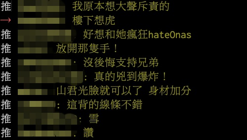 PTT文章一出,雖然內文中只有一張照片,但卻道盡千言萬語,不少鄉民也紛紛有感而發表示,「超可以~天使的臉魔鬼身材」、「這張圖飽滿了我的內心,豐富我了的感情」、「這張完全可以」、「身材真的好,臉也無邪」、「我怎麼看的到.GIF」、「就是要有肉阿,峮峮有點肉才對味」、「沒後悔支持兄弟」、「山君光臉就可以了 身材加分」。