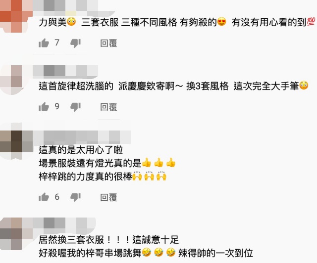 舞蹈影片一出,立刻吸引許多觀眾目光,粉絲們也紛紛現身力挺表示,「每次看妳上電視節目,不管是外景玩遊戲,還是棚內跳舞的,還是靠反應的。都是很認真跟敬業」、「力與美!三套衣服三種不同風格~有夠殺」、「這真的是太用心了啦!梓梓跳的力度真的很棒」、「居然換三套衣服!!!這誠意十足」、「最後Ending的踢腿,真的帥到」、「我家梓哥帥爆了」、「真心建議看完影片再去跟原版MV影片對照,會發現超用心的梓梓還原度超高」。