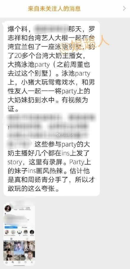 根據《鏡週刊》報導,在宜蘭的泳池趴中,羅志祥戴著漁夫帽,全身都穿著黑色的上衣跟褲子,似乎是為了要低調一點掩飾自己的身份,但還是被其他人給偷拍下來上傳到微博!從照片中可以看到,好朋友大根抱著一位女性朝泳池扔進去,而戴著帽子的小豬則是跟在後面湊熱鬧,一群人還聚在一起大玩鴛鴦戲水!