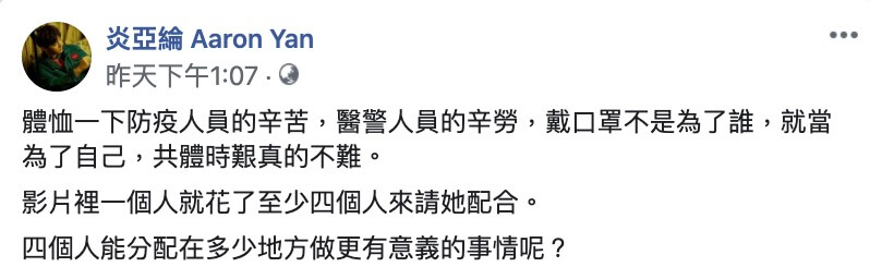 藝人炎亞綸在網路上看到事發過程的影片之後,也轉發分享並在貼文內容中寫道,「體恤一下防疫人員的辛苦,醫警人員的辛勞,戴口罩不是為了誰,就當為了自己,共體時艱真的不難!」並點出影片中的乘客因為不肯配合北捷的規定,讓大家必須得為了她一個人耗費了四個人力,無奈的說,「四個人能分配在多少地方做更有意義的事情呢?」