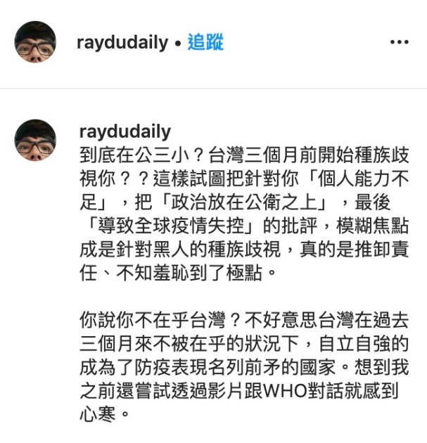 譚德塞一番話,令不少人感到相當傻眼,而過去曾拍攝影片向WHO公開喊話的阿滴,更是對此感到十分心寒,罕見爆粗口怒罵「到底在公三小」!阿滴於個人IG上表示,譚德塞將國際間的批評,模糊焦點成是針對黑人的種族歧視,「真的是推卸責任、不知羞恥到了極點」。