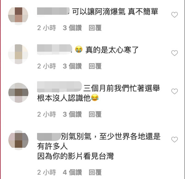 最後阿滴也表示,這三個月來不被在乎的情況下,大家自立自強成為防疫表現名列前茅的國家,而想起過去還嘗試透過影片與WHO對話,瞬間感到心寒。阿滴貼文一出,立刻引起不少人關注,紛紛留言表示,「現在明明是要關注疫情然後他給我在扯種族?」、「譚德賽真的誇張到最高點」、「三個月前台灣明明還在總統大選欸」、「我差點以為這不是阿滴的帳號...看到也超難過超生氣」、「可以讓阿滴爆氣真不簡單」。