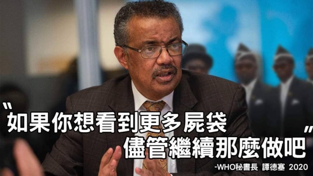 武漢肺炎疫情大爆發,許多國家皆淪陷,同時開始質疑世界衛生組織處理不當,面對國際間來的批評,譚德塞卻在記者會上,將矛頭指向台灣,指責台灣對他人身攻擊長達三個月,對此他已忍受許久,同時他也提到自己因為膚色的關係,引來不少種族歧視,試圖藉此模糊焦點,將鍋甩到別人身上!同時譚德塞也和美國總統川普隔空互嗆,直呼不該將新冠病毒政治化,「但如果你想擁有更多的屍體袋,那麼那就去做。」