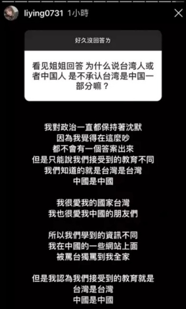 日前劉力穎開放限時動態問答,其中有網友詢問喜歡的男生是否為韓國人?對此她則回覆,「有可能是台灣人或日本人或中國人XD」,沒想到這個回答卻引來軒然大波,立刻有網友質問劉力穎是否不承認台灣是中國的一部分。而劉力穎則回應,兩邊受到的教育、資訊不同,「我們知道的就是台灣是台灣,中國是中國」。