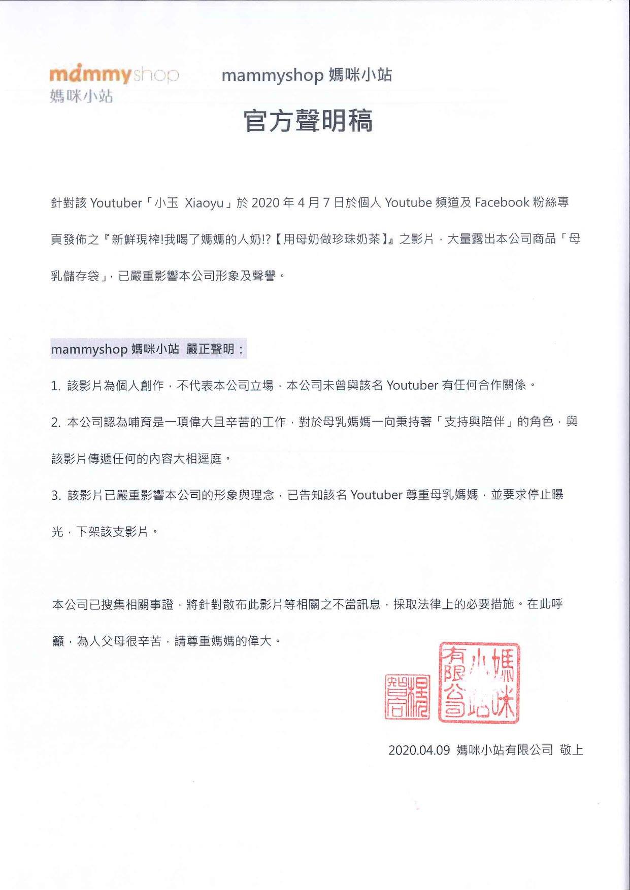 網紅「小玉」自成為YouTuber以來,爭議行為不斷,引起大眾負面觀感。日前小玉上傳新片,開箱「母乳」,過程中不斷頻頻作嘔,甚至直呼有「狗味」,令不少媽媽看了心碎!而影片當中大量曝光的母乳袋公司「mammyshop媽咪小站」,也因此聲譽受到影響,發出嚴正聲明。