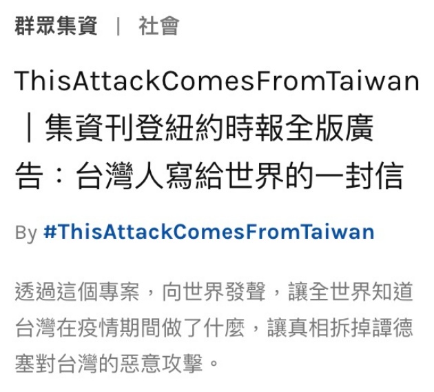 該集資專案題目為「集資刊登紐約時報全版廣告:台灣人寫給世界的一封信」,其中說明處提到,希望能透過這個專案,向世界發聲,讓全世界知道台灣在疫情期間做了什麼,「讓真相拆掉譚徳塞對台灣的惡意攻擊」。集資團隊也指出,靠著WHO接收新聞的各國人民,應該拿回「知的權利」,從中瞭解台灣人不是網軍、不是誰的附屬品,而是受過傷理解真相後,急著想要出力幫忙的一群小國小民!