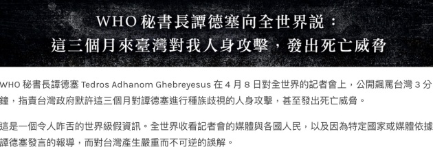 日前世界衛生組織秘書長「譚徳塞」在記者會上指出,遭到台灣嚴重的人身攻擊,時間長達3個月,一番話令國內民眾感到十分傻眼,政府部門、藝人、網紅等皆紛紛站出來抨擊,譴責「譚徳塞」對台灣莫須有的罪名。而目前YouTuber「阿滴」、「志祺七七」、設計師「聶永真」等人發起民眾集資,盼能募集到400萬元,刊登紐約時報廣告向世界發聲!