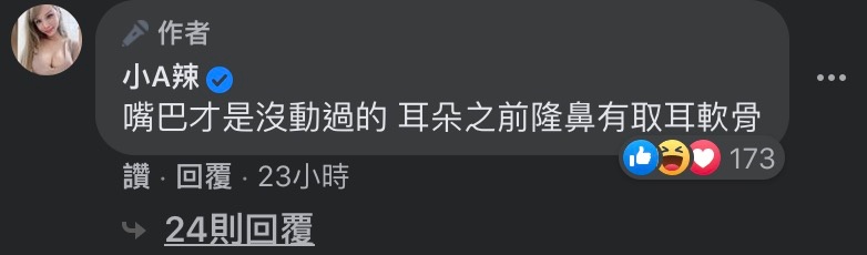 經過一番激烈猜測後,大多數人認為答案是嘴巴或是耳朵,最終小A辣公布解答表示,「嘴巴才是沒動過的,耳朵之前隆鼻有取耳軟骨」。對於小A辣勇敢追尋自己心目中的樣子,粉絲們也紛紛現身力挺,「不管你變得如何都是支持你!」、「太強了,總覺得可以忍受手術過程跟之後復原時期的痛的人,都超級厲害」、「內心的美會比外在的美更重要,希望路能越走越平順」。